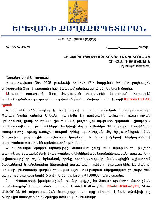 «ԻԱԿ-ի հարցմանն ի պատասխան՝ Երևանի քաղաքապետարանը նշել է, որ Երևանի բալետային 3-րդ միջազգային փառատոնի իրականացման ուղղությամբ կատարված ընդհանուր ծախսը կազմել է շուրջ 1,003,647,100 ՀՀ դրամ: