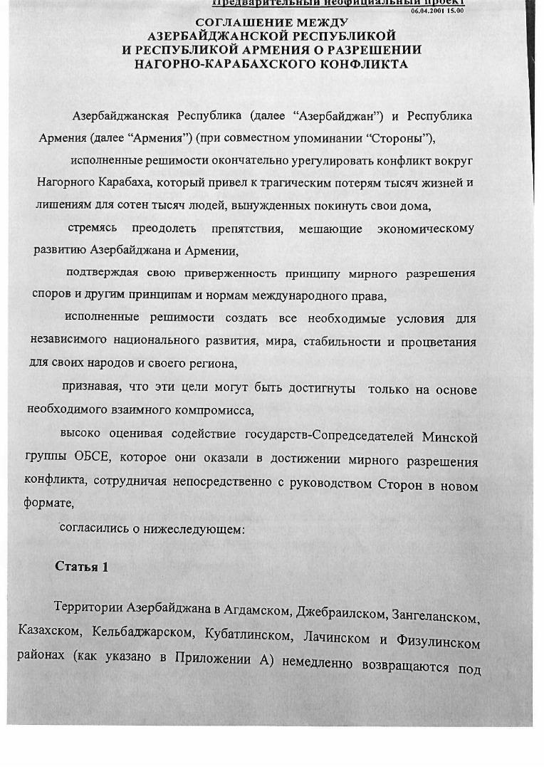 Քանի որ Մինսկի խմբի և գործընթացի էջը ԵԱՀԿ-ն փակել է, բոլոր փաստաթղթերը գաղնտազերծվել են (այս վերջին հաստատումը Նիկոլ Փաշինյանը կառավարության հետ հարցուպատասխանի ժամանակ չհերքեց) թույլ տվեք ես էլ հրապարակեմ իմ անձնական արխիվում շա՜տ երկար տարի գտնվող մի փաստաթուղթ (դրանից մի հատված)։ Այդ փաստաթուղթը ես պահել եմ ավելի քան 20 տարի։ Ի դեպ, ունեմ թղթեր, որոնք առավել քան 30 տարվա վաղեմություն ունեն։
