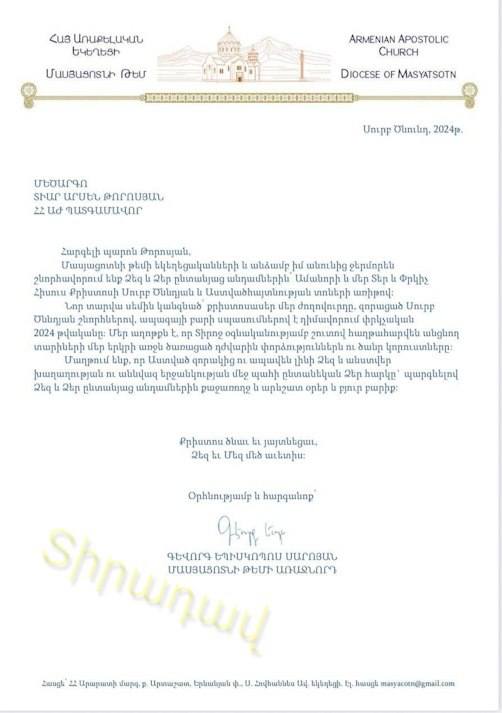 Հրապարակվել է փաստաթուղթ, որտեղ հստակ երևում է 2023-2024 թվից ՔՊ-ական նախարար աթեիստ Արսեն Թորոսյանը կոնտակտի մեջ է եղել Մասյացոտն թեմի առաջնորդ Գեւորգ Սրբազանի հետ