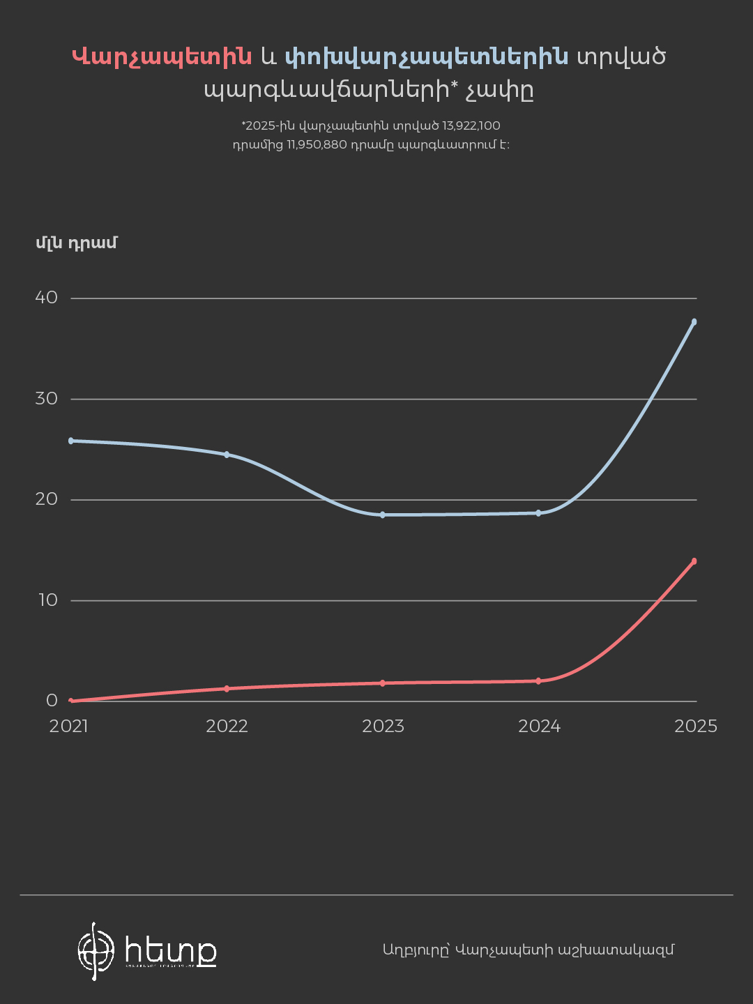 2 մլրդ 835 մլն 550 հազ. դրամ գումարից մոտ 381 մլն 848 հազ. դրամը հատկացվել է որպես պարգևավճար՝ 2025թ. առաջին կիսամյակի գործունեության առաջնահերթությունների և դրանց կատարողականի արդյունքային ցուցանիշների հիման վրա: Գումարը ստացել են այդ ժամանակահատվածում աշխատած 412 աշխատակիցները, ինչպես նաև վարչապետն ու երկու փոխվարչապետները: «Հետքի» գրավոր հարցմանը պատասխանել է Կառավարության տեղեկատվության և հասարակայնության հետ կապերի վարչության պետ Արմեն Խաչատրյանը: