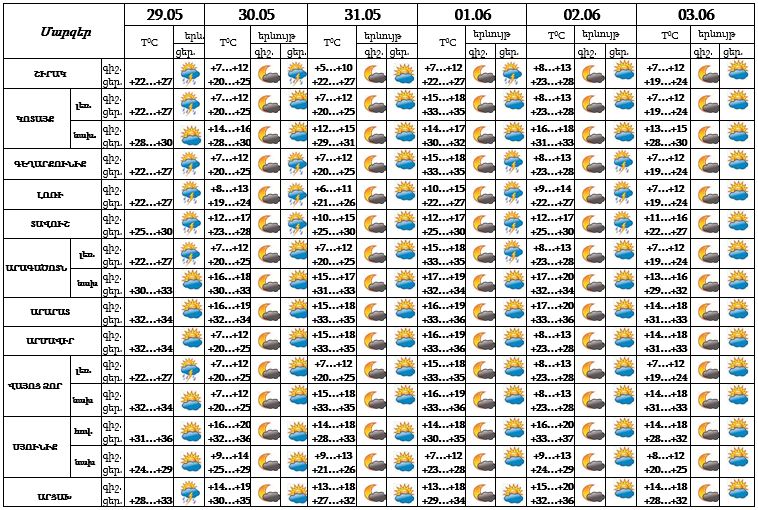 Հանրապետության տարածքում` մայիսի 29-ի ցերեկը, 30-ին, հունիսի 1-2-ը կեսօրից հետո առանձին շրջաններում սպասվում է անձրև և ամպրոպ, առանձին հատվածներում հնարավոր է կարկուտ։ Մայիսի 31-ին, հունիսի 3-ին սպասվում է առանց տեղումների եղանակ։ Այս մասին հայտնում են ԱԻՆ-ից։