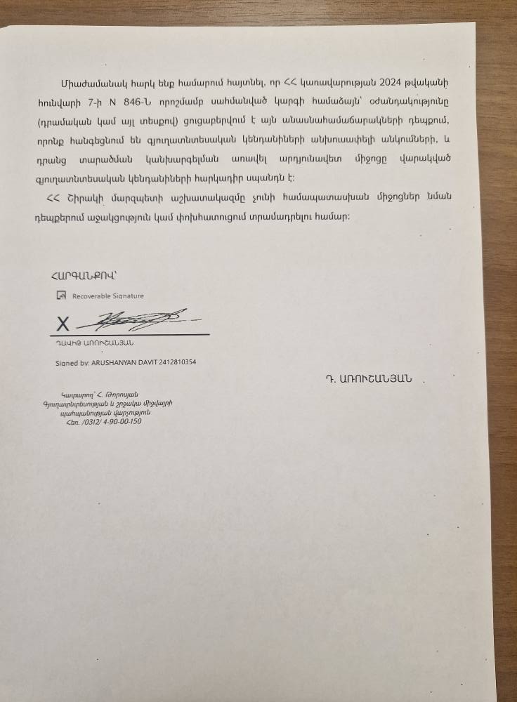 Երկու ամիս առաջ ահազանգել էի, որ Աշոցք համայնքի Թորոսգյուղ բնակավայրում գայլերը հոշոտել են գյուղացիների ոչխարներին։ Ահազանգից անմիջապես հետո գրավոր դիմել էի ինչպես Աշոցքի համայնքապետարանին, այնպես էլ Շիրակի մարզպետին և Տարածքային կառավարման և ենթակառուցվածքների նախարարությանը։