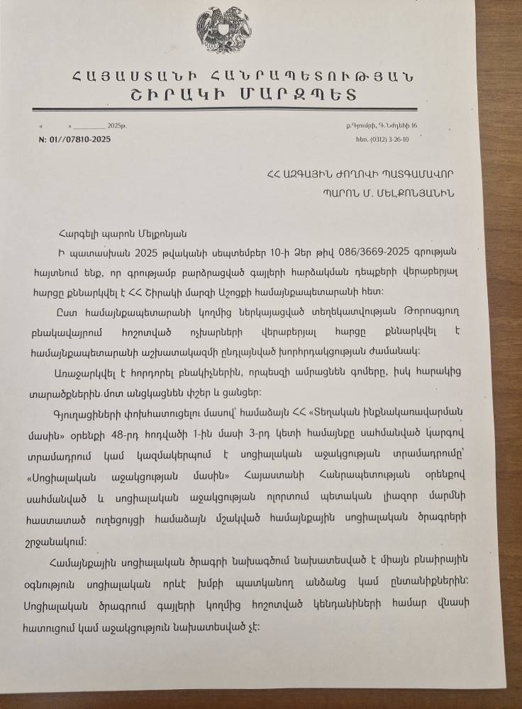 Օրերս ստացա Շիրակի մարզպետից պատասխան, որն ուղղակիորեն խայտառակություն կարելի է անվանել։ Պատասխանի համաձայն՝ հարցն իբր քննարկվել է Աշոցքի համայնքապետարանի ընդլայնված խորհրդակցության ժամանակ, և դրա լուծման առաջարկվող տարբերակներն ուղղակի զավեշտալի են։