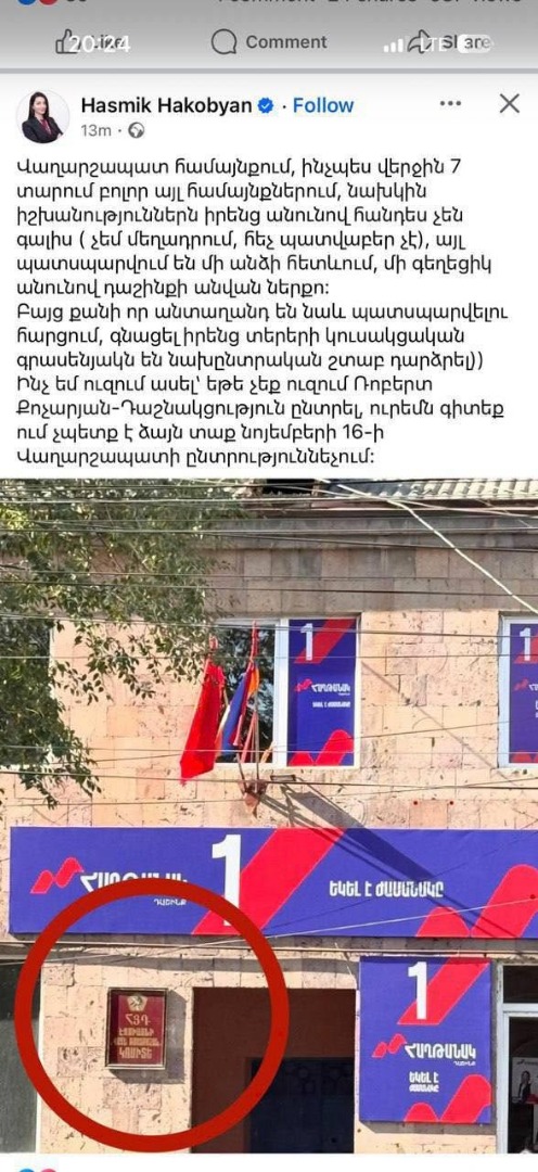 «Փաստորեն, Վաղարշապատի ընտրություններում մեր դեմ այլ «կոմպրոմատ» չկա: Մեզ միայն մեղադրում են, ուշադրություն, որ նախընտրական շրջանում կուսակցության գրասենյակը (այն կուսակցության, որը պաշտոնապես դաշինքով մասնակցում է ընտրություններին) վերածել ենք նախընտրական շտաբի: