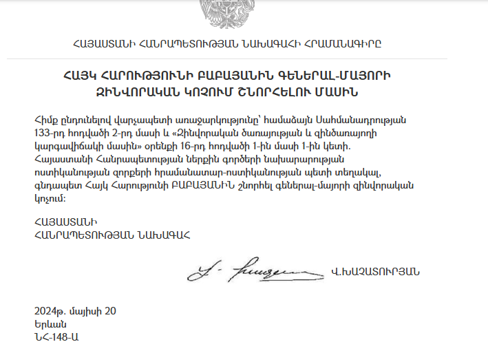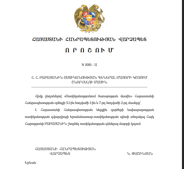 Այսօր հայտնի դարձավ, որ Նիկոլ Փաշինյանի որոշմամբ՝ Ներքին գործերի նախարարության ոստիկանության գվարդիայի հրամանատար-ոստիկանության պետի տեղակալ Հայկ Բաբայանին շնորհվել է ոստիկանության գեներալ-մայորի կոչում, մինչդեռ, սա Բաբայանի համար գեներալ-մայորի առաջին կոչումը չէր։ Պարզվում է՝ դեռ մեկ տարի առաջ՝ 2024թ․ մայիսի 20-ին ՀՀ նախագահի հրամանագրով՝ Բաբայանին շնորհվել էր գեներալ-մայորի կոչումը։ Թե ինչու են նրան երկու անգամ շնորհել նույն կոչումը՝ պարզ չէ, թերևս առաջնորդվել են «շատ լինի, քիչ չլինի» սկզբունքով։