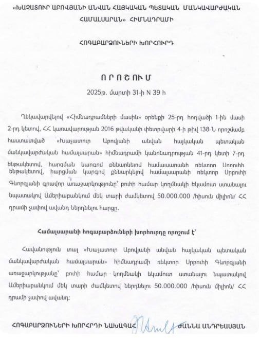 4. Տիկին ժաննան փորձում է մանկավարժականի ներդրած 50 միլիոն դրամ ավանդը ներկայացնել որպես անձեռնմխելի դրամագլուխ: Այս փաստը իրականության հետ որևէ աղերս չունի: Կից ներկայացնում ենք մամուլում առկա հոգաբարձուների խորհրդի՝ իր ստորագրած որոշումը մանկավարժականի 50 միլիոն դրամը ավանդադրելու վերաբերյալ: Ի դեպ, այդ որոշումը ևս բավականին անգրագետ է կազմված: Որոշման հիմք է ներկայացվել «Հիմնադրամների մասին» ՀՀ օրենքի 25-րդ հոդվածի 1-ին մասի 2-րդ կետը, որն ընդհանրապես կապ չունի տիկին Ժաննայի ընդունած որոշման բովանդակության հետ: