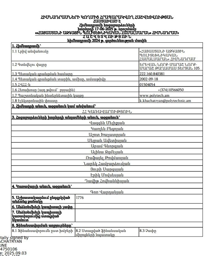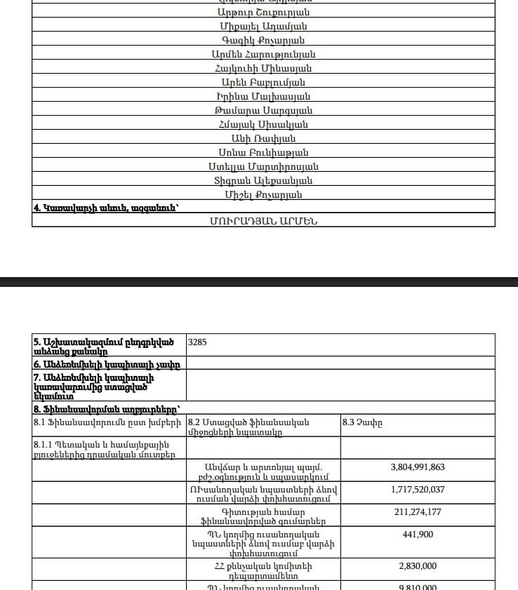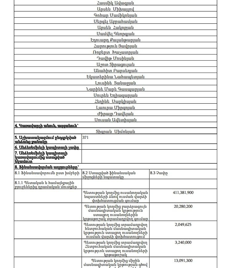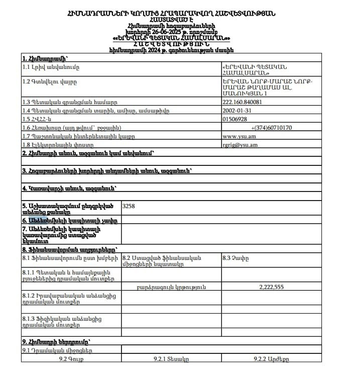 Այս սուտը բացահայտելու համար կից տեղադրում ենք Երևանի պետական, պոլիտեխնիկական, բժշկական, մանկավարժական, ագրարային, Բրյուսովի, ճարտարապետության և շինարարության համալսարանների ու ֆիզկուլտինստիտուտի 2024 թ գործունեության հաշվետվություններից քաղվածքներ, որոնցում հստակ երևում է, որ «Անձեռնմխելի կապիտալի չափը և «Անձեռնմխելի կապիտալի կառավարումից ստացված եկամուտ» տողերում զրոներ են: Տիկի՛ն Ժաննա , այս տեղեկատվությունը հասանելի է ՊԵԿ կայքում, կարող եք այցելել: