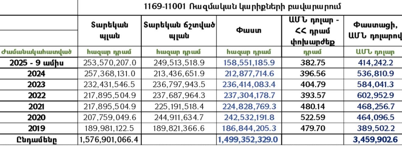 Իսկ ճշմարտությունը ներկայացված է այս աղյուսակում: Նույնիսկ, եթե համարենք, որ զենքը միշտ գնել են պարտքով, ապա 2019-ից սկսած, մինչ օրս, ռազմական կարիքների գծով ամբողջ ծախսերը, որ գումարենք հազիվ 3.5 միլիարդ դոլար է անում: