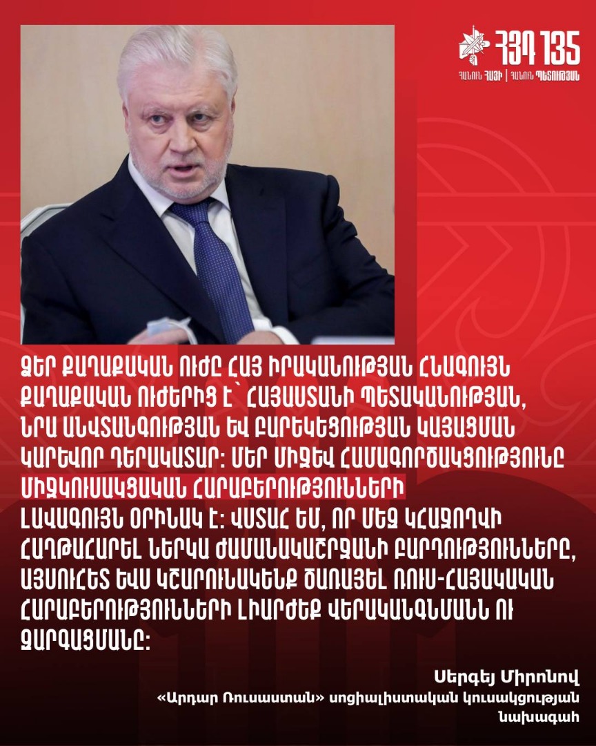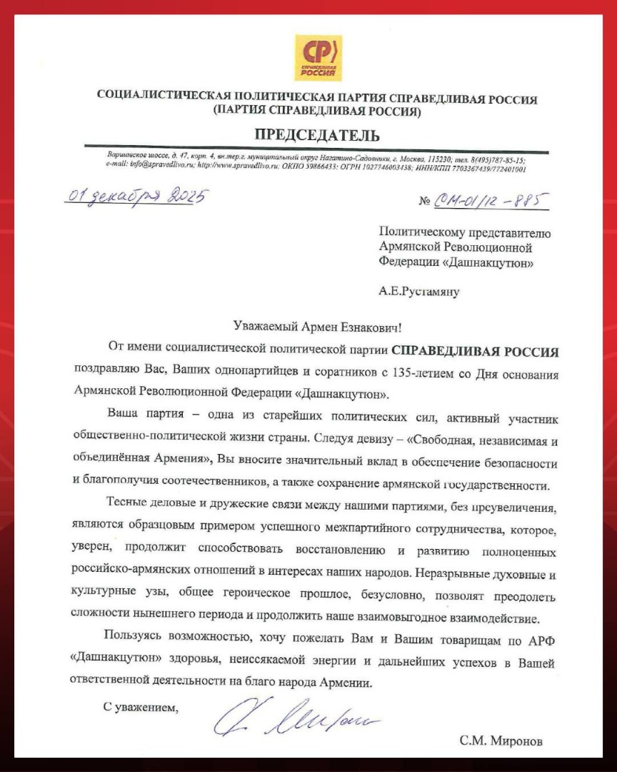 ««Արդար Ռուսաստան» սոցիալիստական քաղաքական կուսակցության անունից շնորհավորում եմ Ձեզ, Ձեր կուսակիցներին և ընկերներին Հայ Յեղափոխական Դաշնակցության հիմնադրման 135-ամյակի կապակցությամբ։