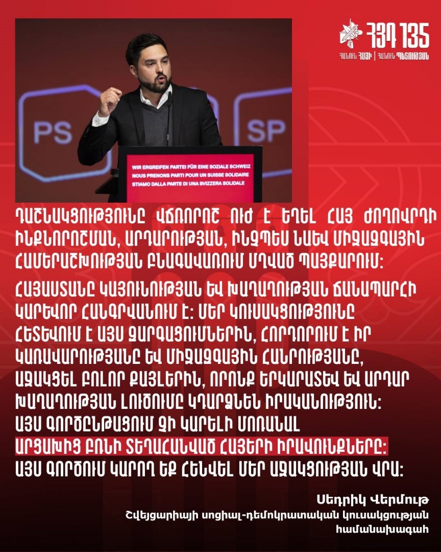 Հայաստանը գտնվում է կարևոր հանգրվանում՝ կայունության և խաղաղության ճանապարհին։ Շվեյցարիայի սոցիալ-դեմոկրատական կուսակցությունը մեծ հետաքրքրությամբ հետևում է այս զարգացումներին և հորդորում է իր կառավարությանը և միջազգային հանրությանը, ինչպես նաև Հայաստանին և Ադրբեջանին, աջակցել բոլոր քայլերին, որոնք երկարատև և արդար խաղաղության լուծումը կդարձնեն իրականություն։ Այս գործընթացում չի կարելի մոռանալ Արցախից ուժով տեղահանված հայերի մարդու իրավունքները, և անհրաժեշտ է դրանց լուծումը։ Դուք կարող եք այս գործում հենվել մեր աջակցության վրա։