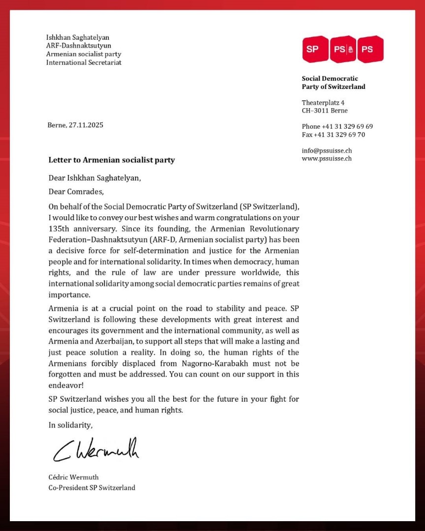 Շվեյցարիայի սոցիալ-դեմոկրատական կուսակցությանը շնորհավորական ուղերձ է հղել ՀՅԴ-ին 135 ամյակի առթիվ, որում ասվում է.