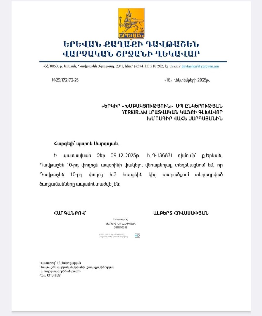 Օրերս կրկին ստացանք Դավթաշեն վարչական շրջանի ղեկավարի պատասխանն առ այն, որ Դավթաշեն վարչական շրջանի 10-րդ հ․ 3 հասցեին կից տարածքում տեղադրված ծաղկամաններն ապամոնտաժվել են։ Բերված լուսանկարներից, սակայն, պարզվում է, որ ծաղկամանները ոչ թե ապամոնտաժվել են, այլ մի փոքր կողքի քշվել։