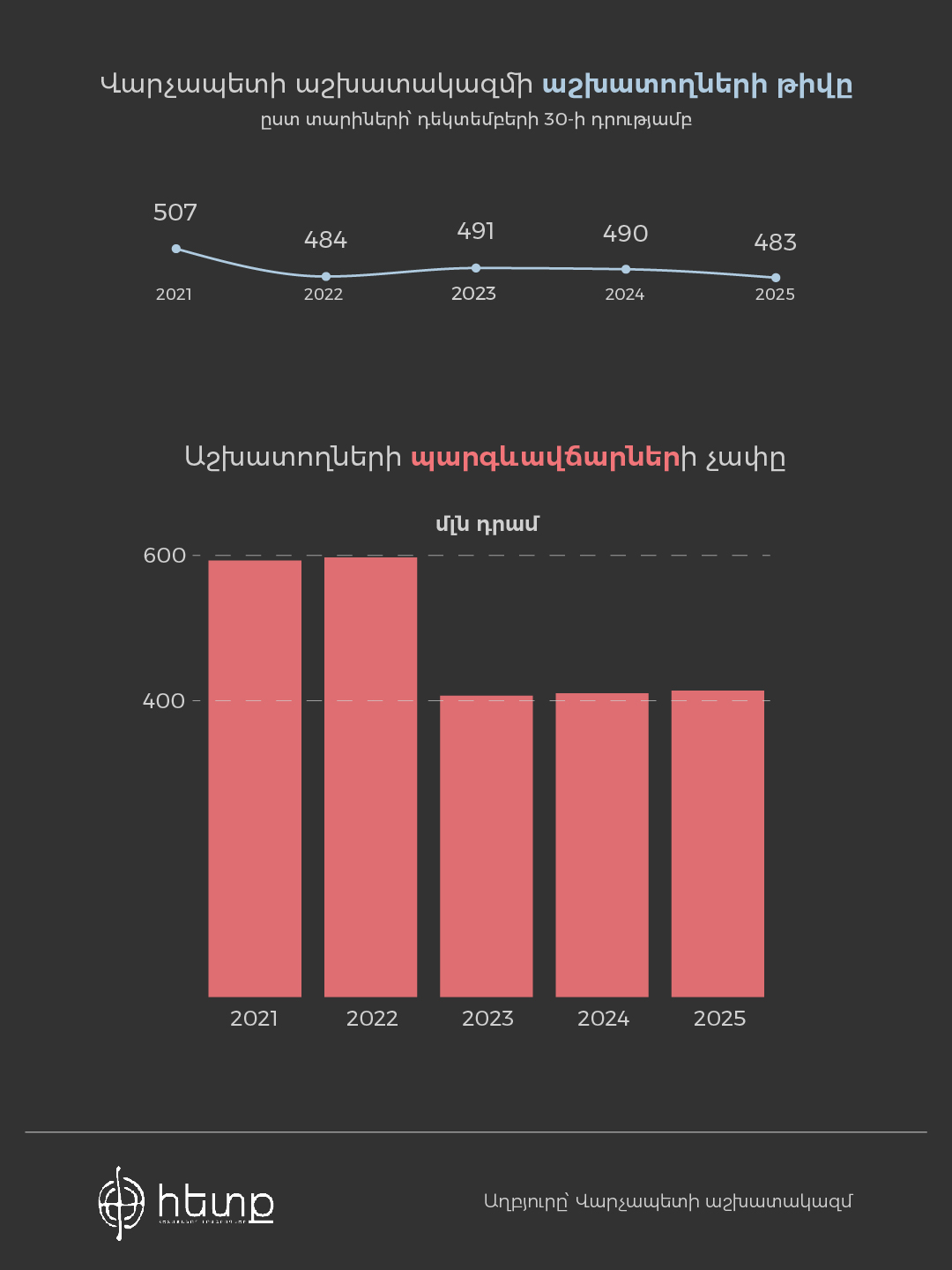 2 մլրդ 835 մլն 550 հազ. դրամ գումարից մոտ 381 մլն 848 հազ. դրամը հատկացվել է որպես պարգևավճար՝ 2025թ. առաջին կիսամյակի գործունեության առաջնահերթությունների և դրանց կատարողականի արդյունքային ցուցանիշների հիման վրա: Գումարը ստացել են այդ ժամանակահատվածում աշխատած 412 աշխատակիցները, ինչպես նաև վարչապետն ու երկու փոխվարչապետները: «Հետքի» գրավոր հարցմանը պատասխանել է Կառավարության տեղեկատվության և հասարակայնության հետ կապերի վարչության պետ Արմեն Խաչատրյանը: