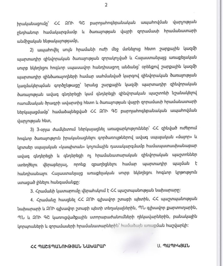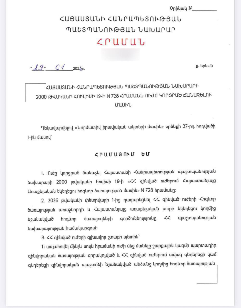 Տարընթերցումներից զերծ մնալու նպատակով հրապարակում եմ հրամանը, որով կարգավորվում է զինված ուժերում հոգևոր ծառայության կազմակերպումը: Այս մասին գրել է Պաշտպանության նախարար Սուրեն Պապիկյանը և հրապարակել է հրամանը։