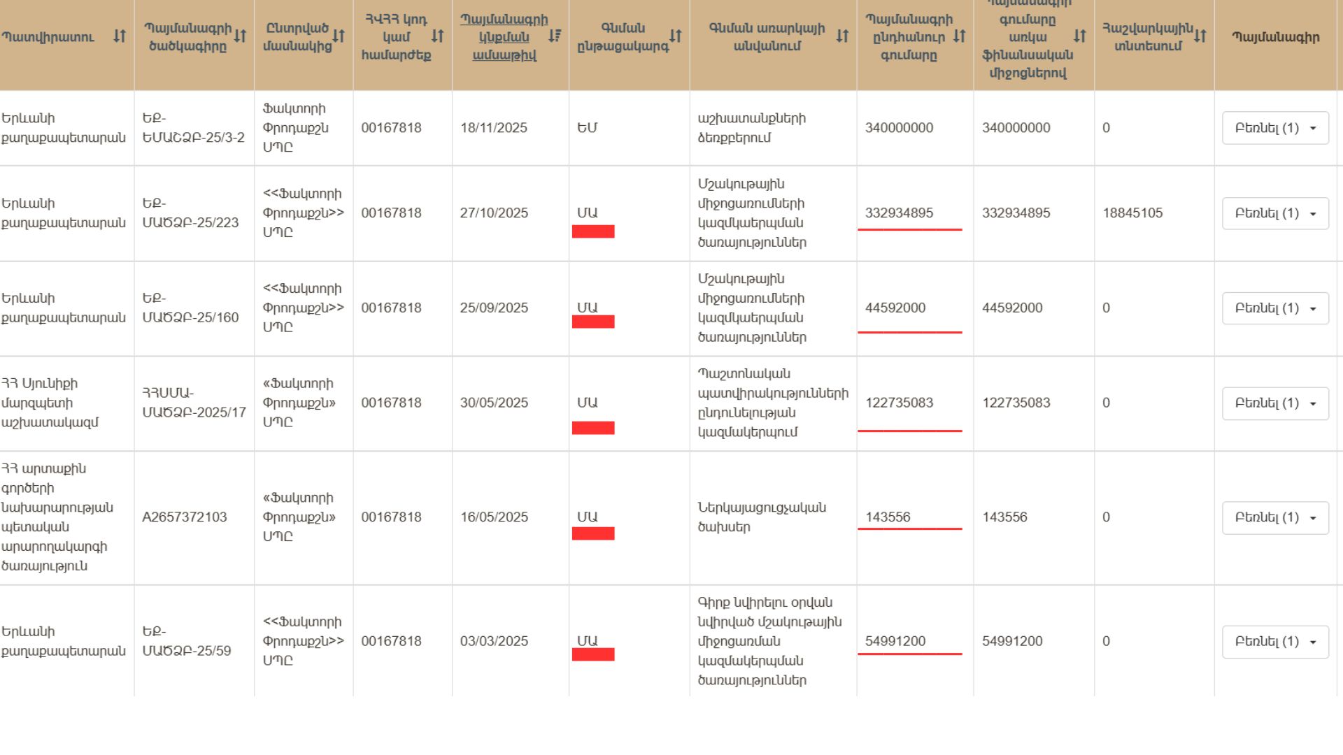 «Ժողովուրդ» օրաթերթը պարզեց, որ «Ֆակտորի Փրոդաքշն» ՍՊԸ-ն միայն 2025 թվականի ընթացքում Երևանի քաղաքապետարանի հետ կնքել է գրեթե 780 մլն դրամ արժեքով պայմանագրեր, ՀՀ Սյունիքի մարզպետի աշխատակազմի հետ՝ 122 մլն 735 հազար դրամի եւ բոլորը մեկ անձից գնումների եղանակով՝ առանց մրցույթի: