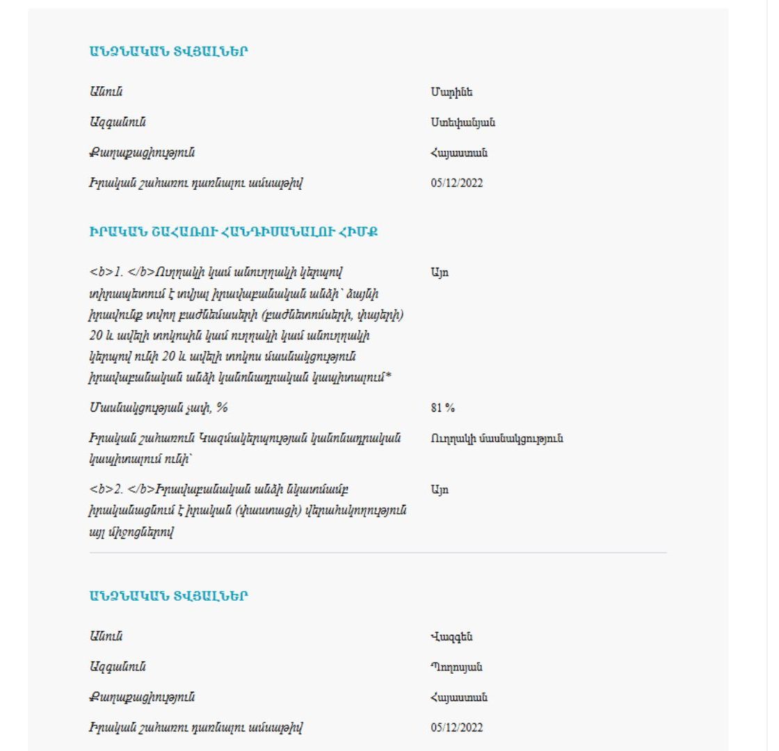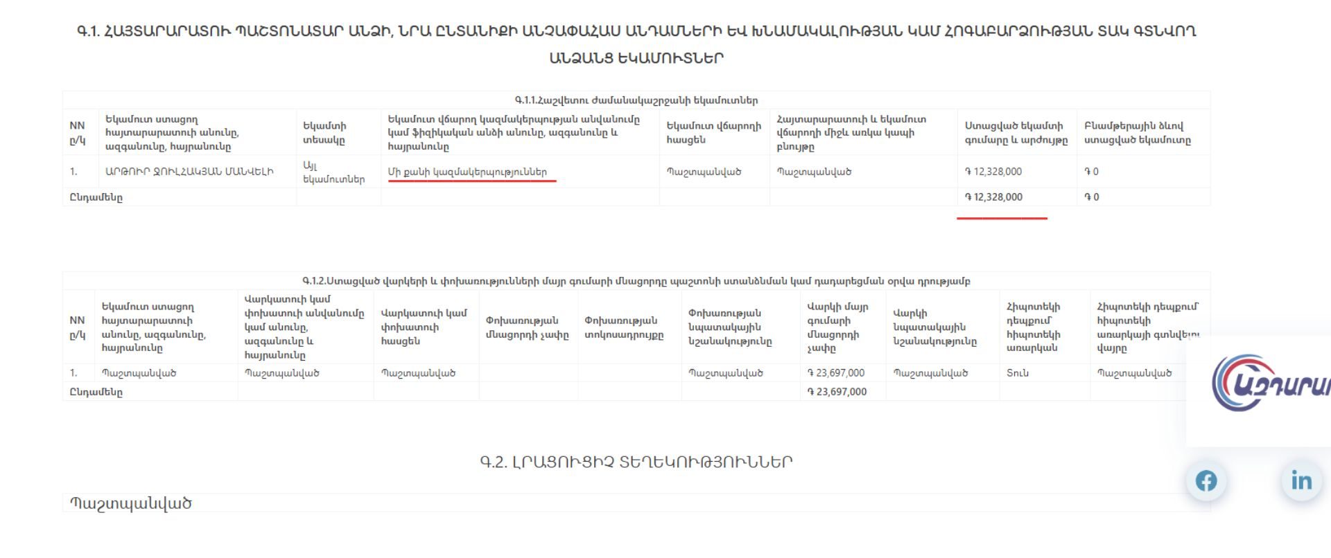 Տեղեկացնենք, որ Կենտրոնի փոխթաղապետը նշանակվել է 2024 թվականի մայիսի 8-ին և ներկայացրել է պաշտոնեկան պարտականությունները ստանձնելու մասին հայտարարագիր։ Համաձայն այդ հայտարարագրի՝ վերջինս 12 մլն 328 հազար դրամի չափով «մի քանի կազմակերպություններ»-ից «այլ եկամուտներ» է ստացել, այնինչ այդ մի քանի կազմակերպությունը, ըստ օրենքի, հատիկ առ հատիկ լրացնել էր պետք։