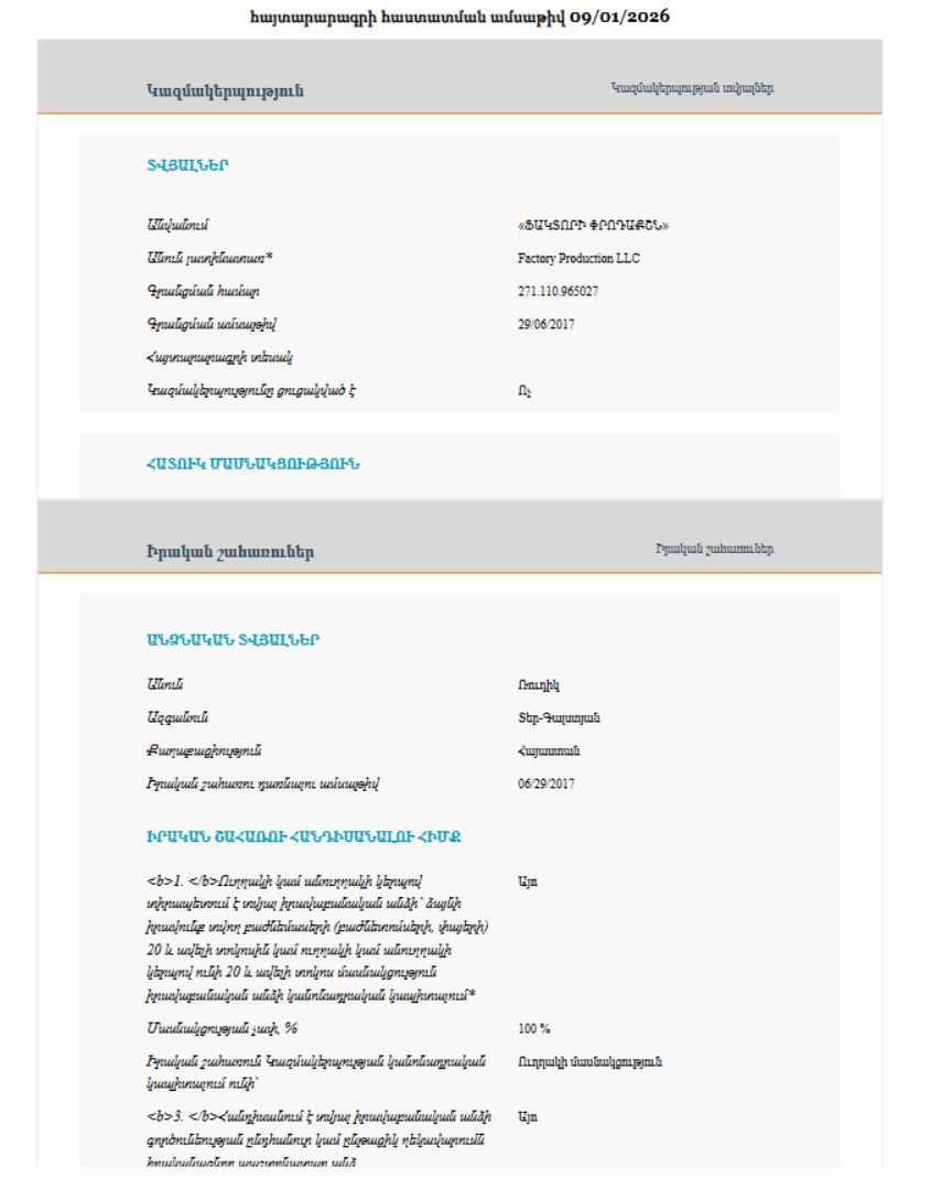 Իրավաբանական անձանց պետական ռեգիստրի տվյալներով՝ «Ֆակտորի Փրոդաքշն» ՍՊԸ-ն հիմնադրվել է 2017 թվականի հունիսի 29-ին։ Ընկերությունը հիմնադրել են Ռուդիկ Տեր-Գալստյանն ու Վազգեն Պողոսյանը, որոնք մինչև 2021 թվականի նոյեմբերի 26-ը ունեցել են 50-ական տոկոս բաժնեմաս, սակայն այդ օրվանից առ այսօր ընկերության 100 տոկոս բաժնեմասերը պատկանում են Ռուդիկ Տեր-Գալստյանին, որը զբաղեցնում է նաև ընկերության տնօրենի պաշտոնը։