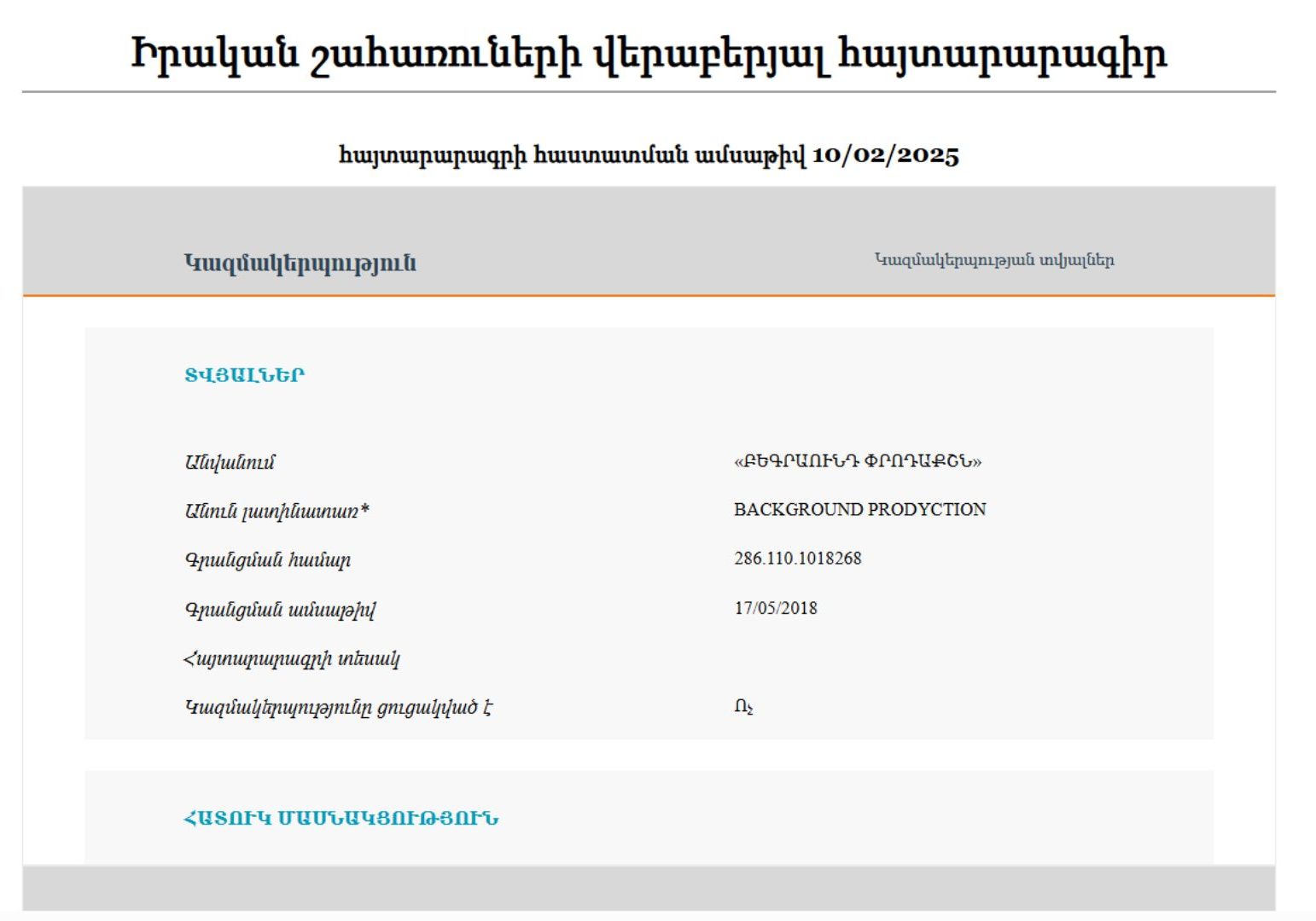 Իհարկե, «Բեգրաունդ Փրոդաքշնը» գնումներում ներգրավված նոր ընկերություն չէ։ Այն 2018 թվականի մայիսին հիմնադրել է սիրված դերասան Հրանտ Թոխատյանի որդին՝ Հրանտ Թոխատյանը։ Չորս տարի անց՝ 2022-ի մայիսին ընկերության բաժնեմասեր են ձեռք բերել Մարինե Ստեփանյանը և Վազգեն Պողոսյանը։