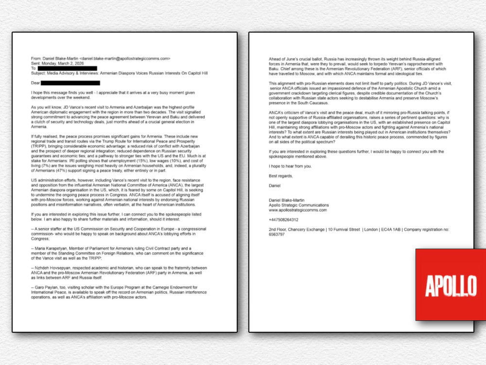 Լոնդոնում տեղակայված “Apollo Strategic Communications” կազմակերպությունը 2026թ․ մարտի 2-ին, ամերիկյան լրատվամիջոցներին ուղարկված նամակով վերջիններիս խմբագիրներին առաջարկել է «ոչ հրապարակային քննարկումներ»՝ նպատակ ունենալով արատավորել Հայ դատի Ամերիկայի հանձնախմբին, արժեզրկել ու վարկաբեկել դրա գործունեությունը։ Ամերիկյան լրատվամիջոցներին ուղարկված փակ նամակը հայտնվել է Հայ դատի Ամերիկայի հանձնախմբի մոտ։ Ուշագրավ է՝ Հայ դատի Ամերիկայի հանձնախմբի վերաբերյալ խոստացվող «տեղեկատվությունն» ամբողջությամբ համապատասխանում է Հայ դատի համակարգի դեմ պայքարում ադրբեջանաթուրքական շրջանակների կողմից օգտագործվող կեղծ պնդումներին։