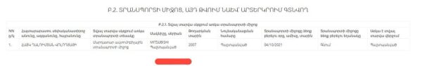 Տրանսպորտային միջոցներից հայտարարագրում նշված է MITSUBISHI մակնիշի ավտոմեքենա՝ 2007 թվականի արտադրության, որը ձեռք է բերվել 2021 թվականի հոկտեմբերի 4-ին։