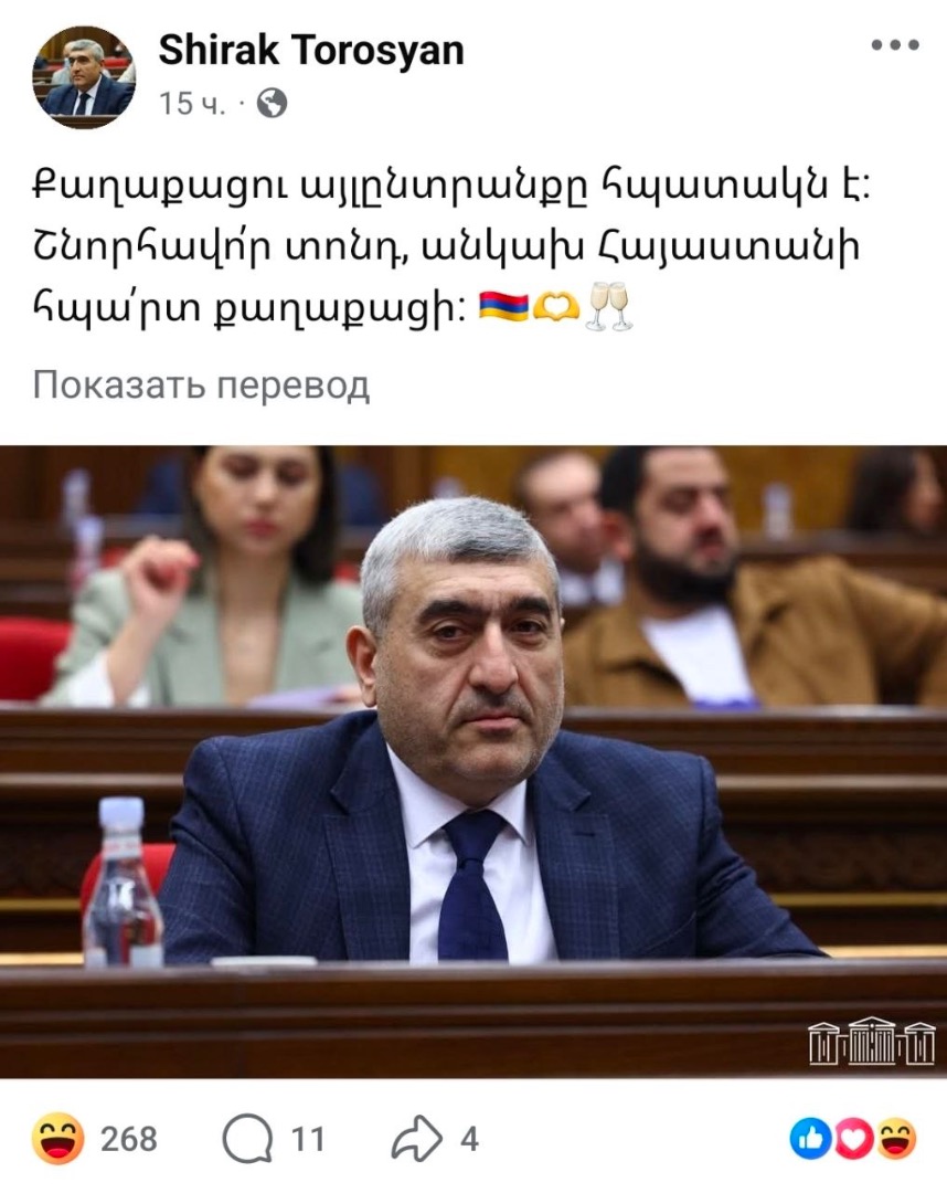 Հիշեցնենք, որ Նիկոլ Փաշինյանի հնարած «Քաղաքացու օրը», ինչի առիթով Երևանի կենտրոնում կազմակերպվել էր քոչվոր ու խաշնարած ցեղերին բնորոշ խորոված փարթի, Շիրակ Թորոսյանը ևս, միանալով այդ խայտառակությանը, հանդես էր եկել «ուղերձով»` նշելով.