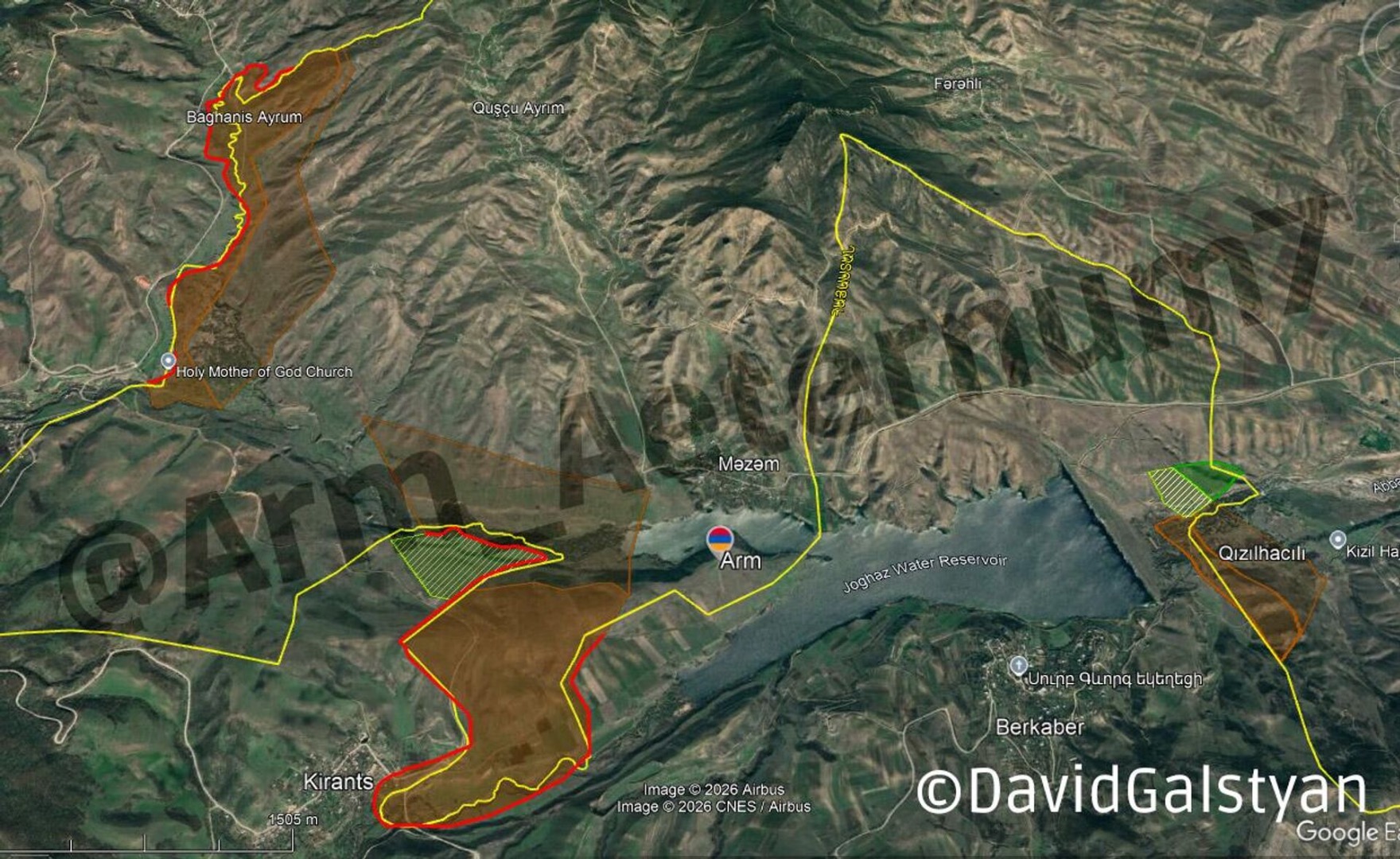 Կարմիր գծով նշված են նոր սահմանի այն հատվածները, որտեղ իրականացվել է սահմանագծում և սահմանազատում, և որտեղ այժմ տեղադրված է փշալարերով ցանկապատ։ Դեղին գիծը ցույց է տալիս սահմանը` ըստ Google-ի: